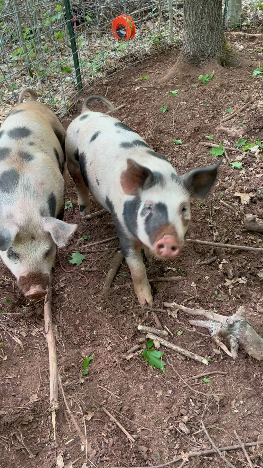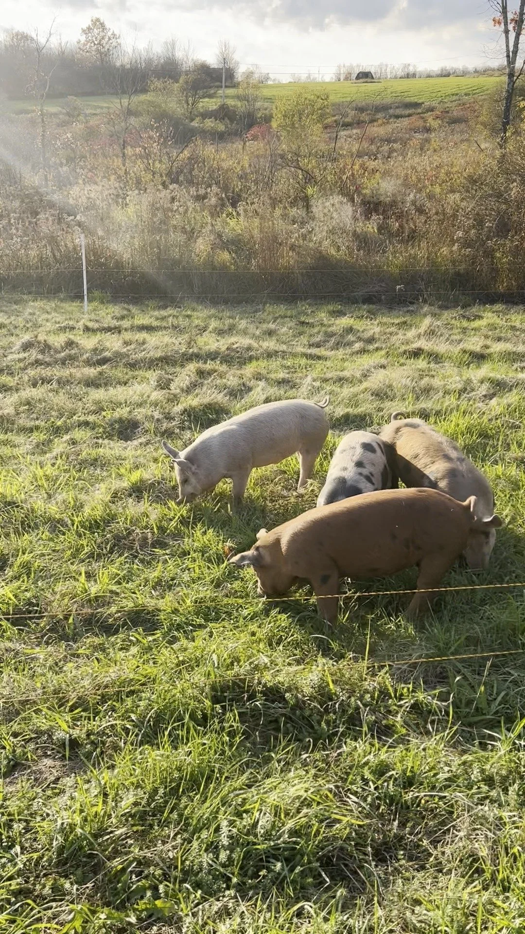 Our pigs naturally root through meadows and forest lots, where they can forage for fallen fruits and nuts, following their natural curiosity and playfulness.